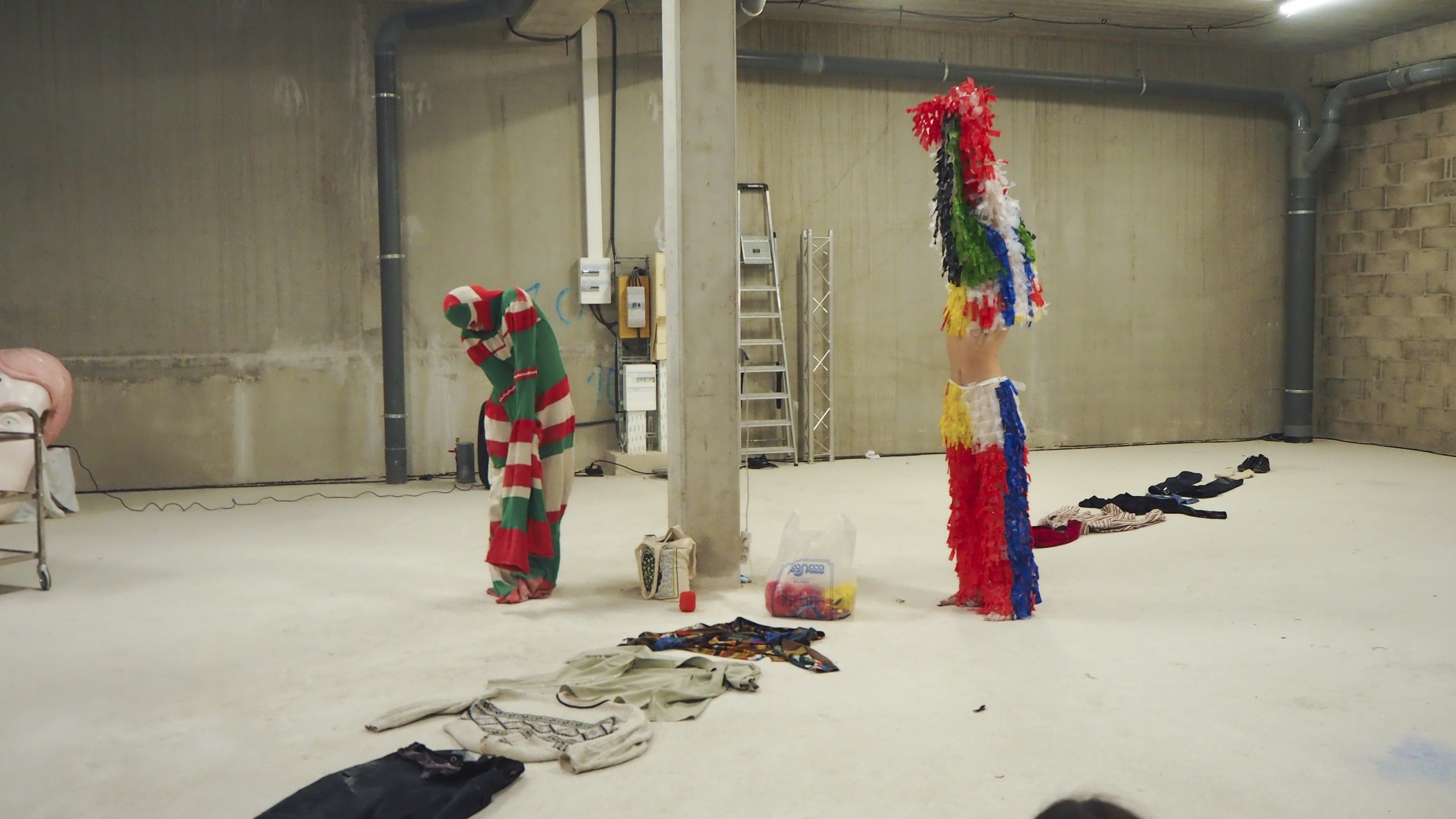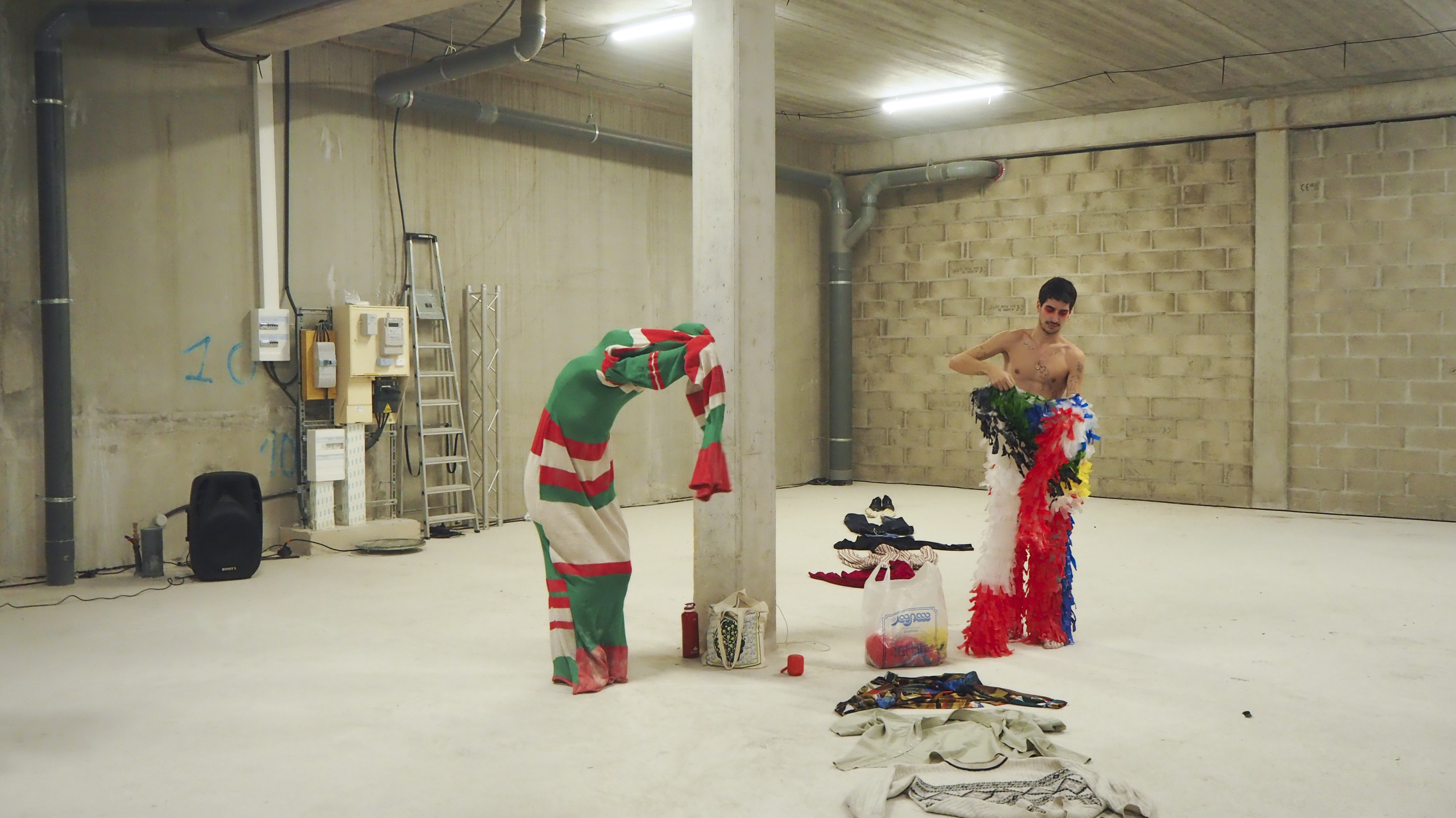 I continued this performance in Brussels, but without the costumes, because they were storage in the Lottozero space. I was alone, pretending to wear the costumes, trying to remake the same choreography.