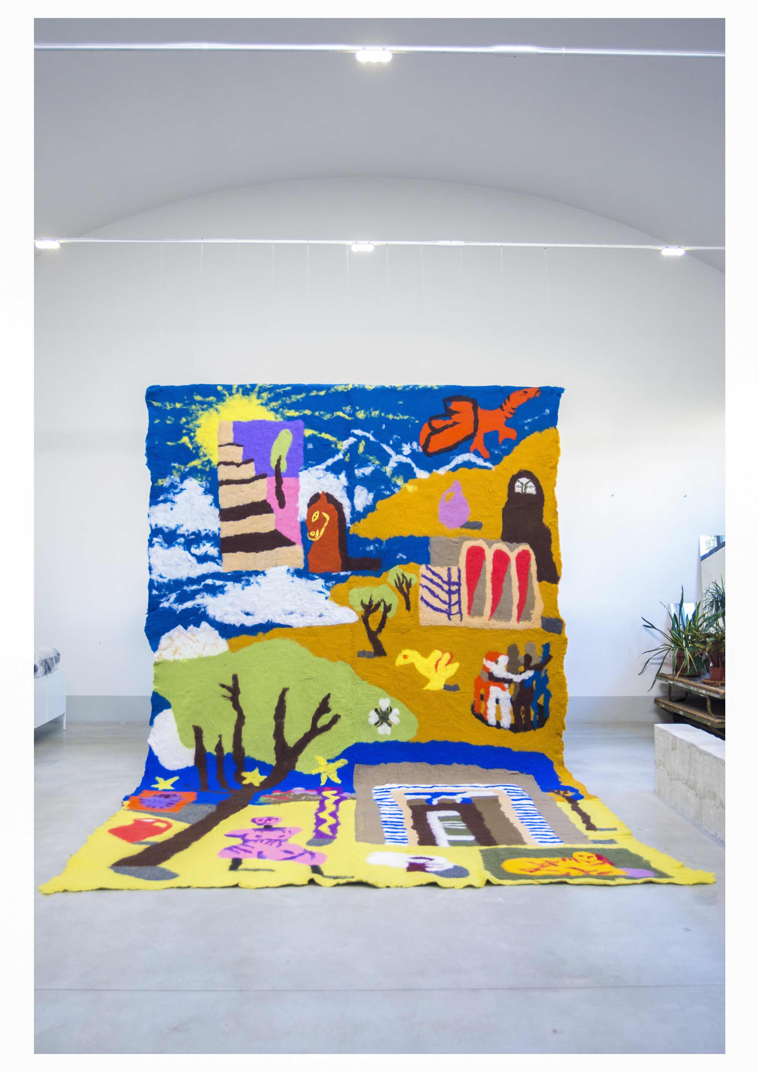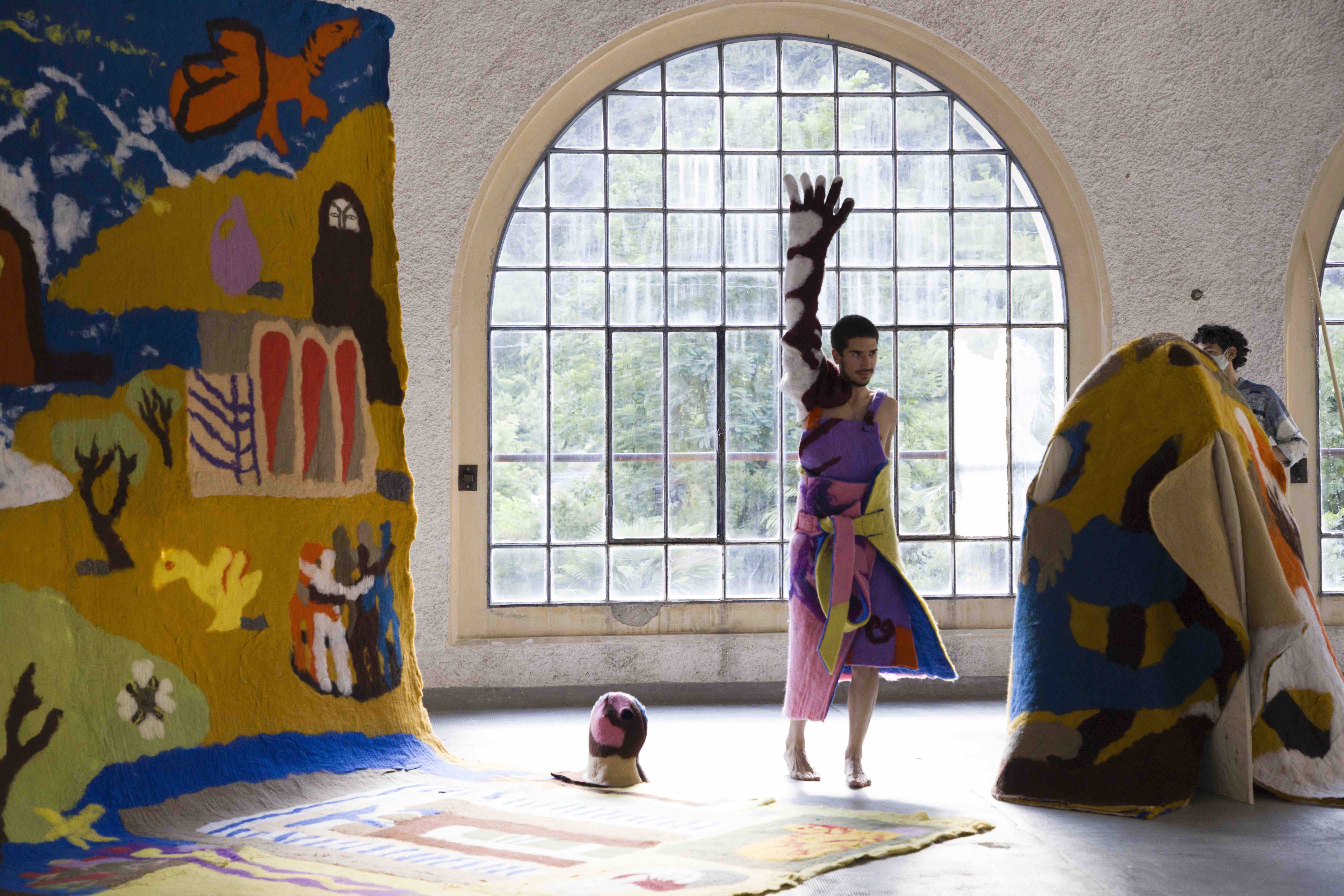 The first part of the project was carried out during a residency at Lottozero (more infos here) in December 2019, and consists in the creation of a huge felt fresco of 6 by 4 meters and a series of costumes, also made out entirely of felt, which were used to create a performance, the final outcome of the project.