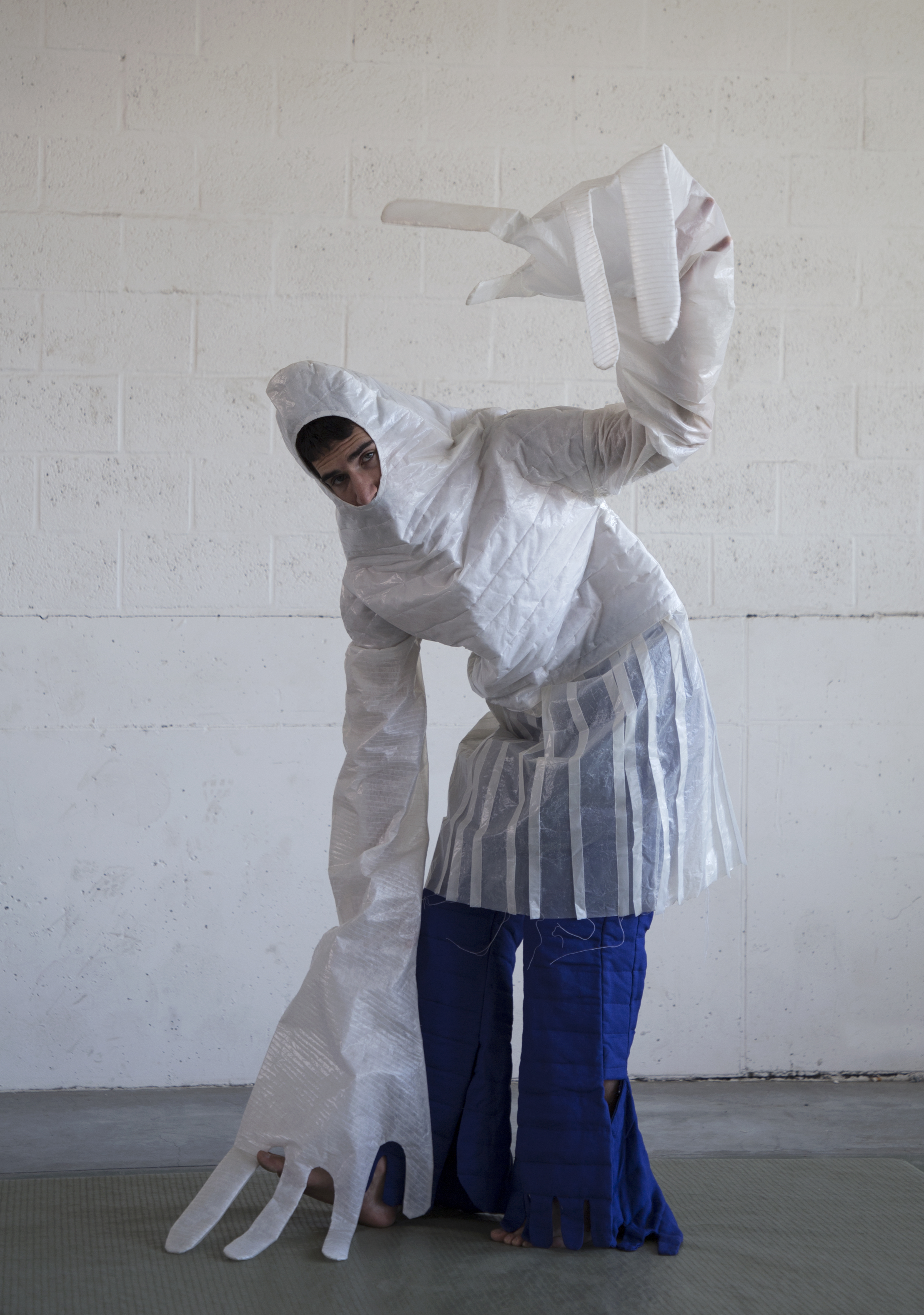 <<A new reality exists and a fictional body emerges. I’m creating costumes, to experience how the cloth can contaminate the body. Experimenting a state where I become danced by the costume him-self. Where the costume in its essence produces choreography.